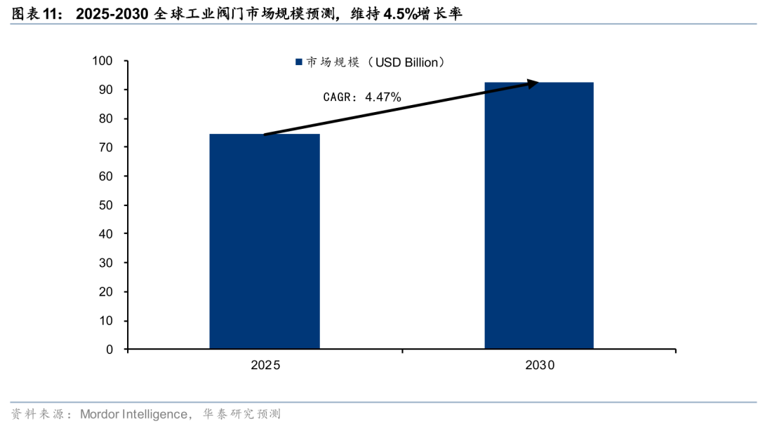 阀门行业正处于需求扩张与技术升级同步推进的关键阶段。受能源、电力、石化及新能源等行业拉动,全球阀门行业市场规模持续增长,Mordor Intelligence预计将由2025年的743亿美元增至2030年的925亿美元,年均复合增长率约为4.5%。产品结构正由传统机械部件向高性能、长寿命与智能化控制方向迈进。总体来看,需求扩张、技术升级与国产化提速共同驱动行业结构加速重塑。因此我们看好阀门行业。