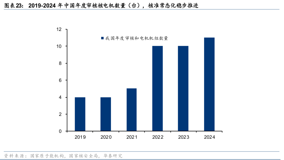 中国常态化核准进程显著。中国在2019年重启核电审批,2019-2021年三年间每年均有新增核准机组数量4-5台;2022年和2023年年均数量明显提升,稳定维持在10台/年;2024年共核准11台,核准常态化稳步推进。据国家核安全局统计,截至2024年12月31日,中国大陆并网运行的核机电组共计58台,仅次于美国(94台),位列世界第二;在建核电机组共计27台,连续18年位居全球第一;在运、在建和核准待建核电机组共计102台,总装机容量1.13亿千瓦,连续第2年位居全球首位。