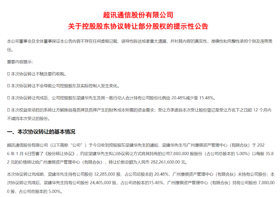 2026年1月6日晚间,超讯通信发布公告披露,公司控股股东梁建华与广州康祺资产管理中心(有限合伙)(以下简称康祺资管)于2026年1月6日签署《股份转让协议》。梁建华拟以协议转让方式将其持有的超讯通信788万股股份(占公司总股本的5%)以每股35.82元的价格转让给康祺资管,转让价款总额为2.82亿元。
