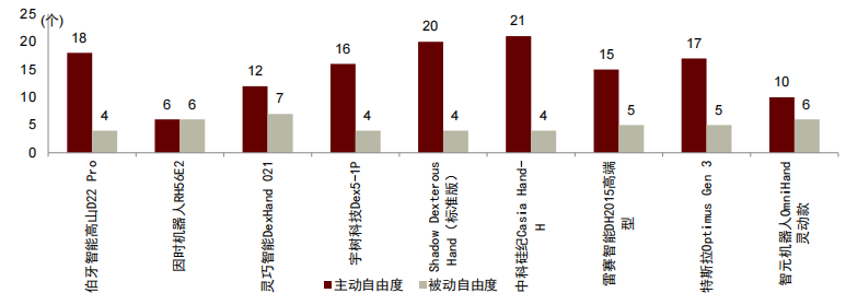 图表13:灵巧手代表厂商主动自由度与被动自由度数量对比