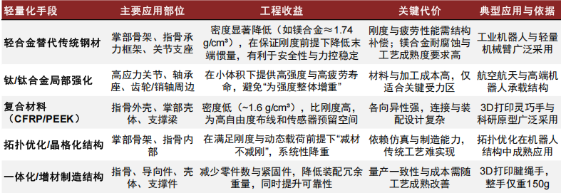 结构件轻量化的主要为材料替换+结构拓扑化。结构件的材料与工艺选择能够将重量降到可控区间,同时为高自由度布线与末端传感器集成释放关键空间。