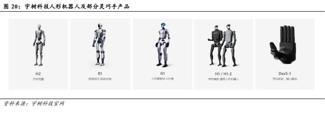 整机产品持续推出,覆盖各类应用场景。10 月 20 日,宇树科技发布全新一代仿生 机器人 Unitree H2。据官方演示视频,该机器人整体形态更接近真人形态,并具备舞蹈、 功夫表演等运动控制能力,亦可身着服饰扮演模特走秀。据悉,这款机器人配备了 31 个关节,具体分布为肩部 6×2(双臂各 6 个)、躯干 3 个、腿部 7×2(双腿各 7 个), 另含 2 个未知功能关节。相比宇树科技此前发布的 R1 机型的 26 个关节,关节数量提升 19%,灵活性显著增强。宇树科技此前已推出 R1、H1、G1 三款人形机器人。其中 R1 7 月 25 日发布,身高 1.2 米左右,目前还未量产。H1 则是登上 2025 年央视春晚表演的人 形机器人,该款机器人发布于 2023 年 8 月,是宇树科技发布的国内第一台能跑的全尺寸 通用人形机器人。G1 发布于 2024 年 5 月 13 日,是 2024 年宇树科技发布的第二款人形 机器人。定价方面,R1 定价为 3.99 万元起,G1 定价 9.9 万元,H1 的定价则为 65 万元。