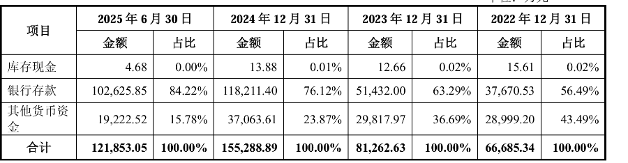 另一方面,招股书显示,惠康科技货币资金主要由银行存款和其他货币资金构成。报告期各期末,公司货币资金分别为6.67亿元、8.13亿元、15.53亿元及 12.19亿元,占流动资产的比例分别为58.65%、45.46%、65.45%及 52.13%。