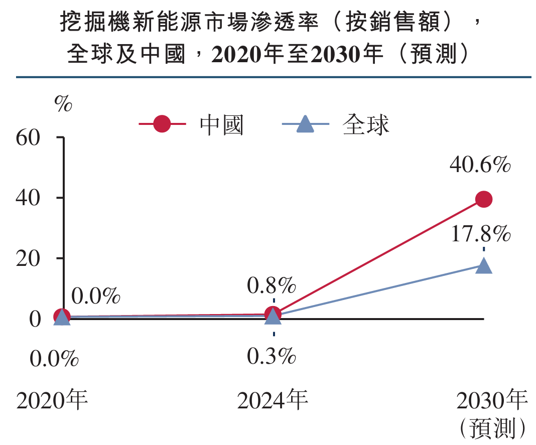 图片说明:2020年至2030年(預測)挖掘机新能源市场渗透率,数据来源于弗若斯特沙利文、三一重工港股招股说明书