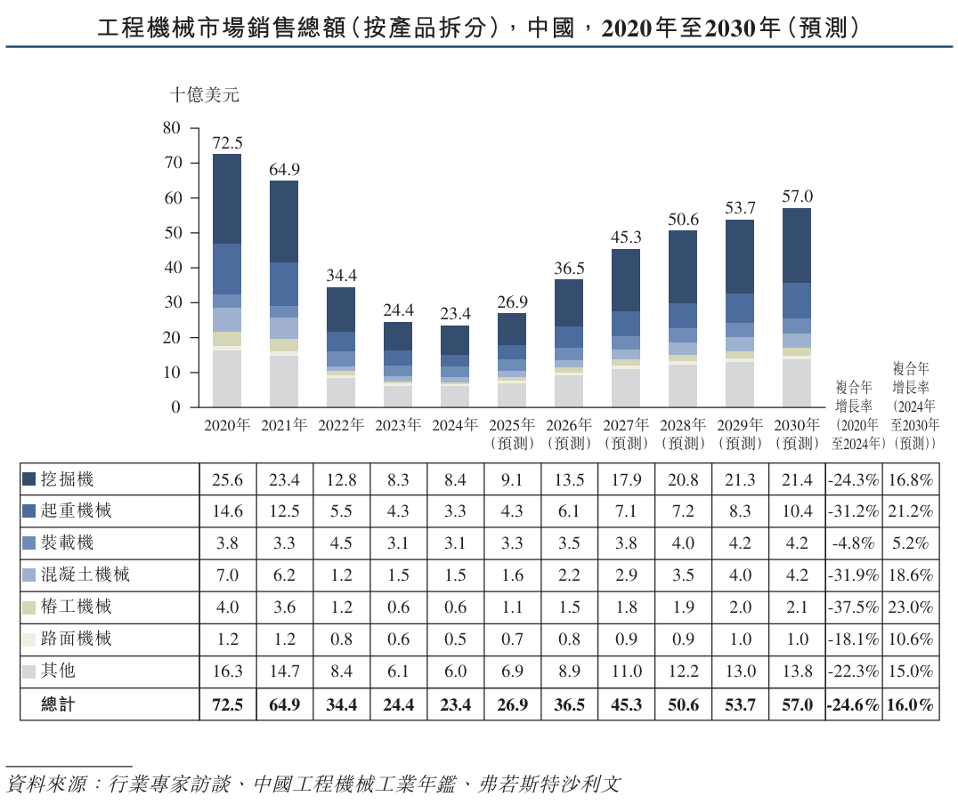 国内市场的稳健复苏是压舱石。根据弗若斯特沙利文的预测,2024至2030年中国工程机械市场销售额复合增长率可达16%,行业步入稳健复苏通道。