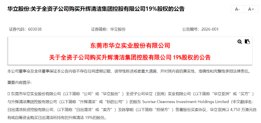 资本市场从不缺少故事,华立股份抛出跨界投资计划,随即引来监管问询。1月16日,华立股份发布公告披露,公司拟以4750万港元收购港交所上市公司升辉清洁19%股权。交易完成后,华立股份将成为升辉清洁的第二大股东。披露收购公告当日,华立股份股价涨停,升辉清洁同日涨幅为26.19%。