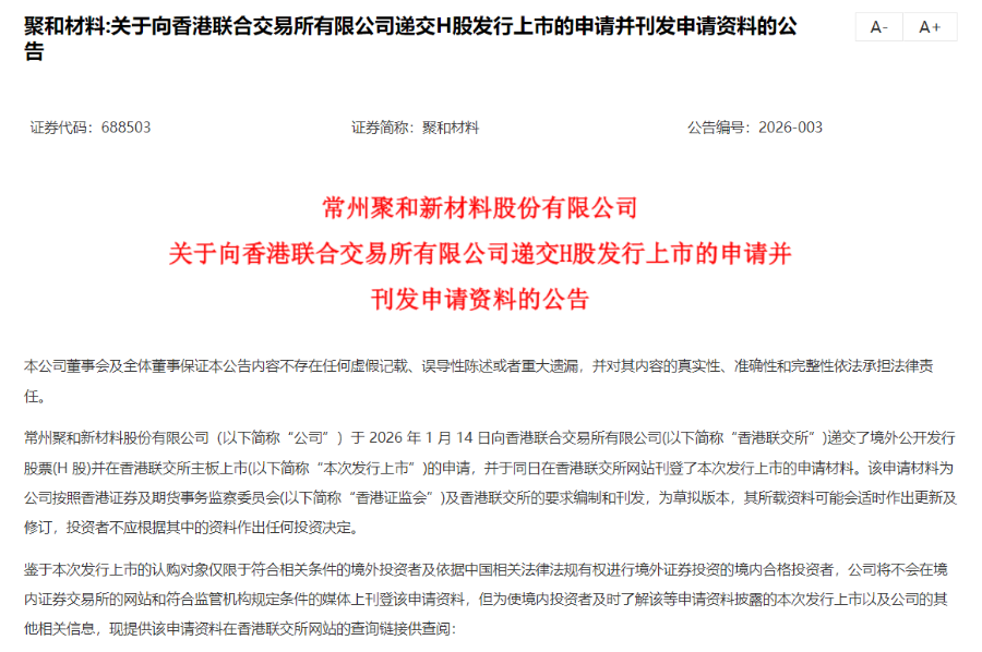 A股科创板上市公司聚和材料于1月14日向港交所呈交了上市申请文件,华泰国际和Jefferies为联席保荐人。