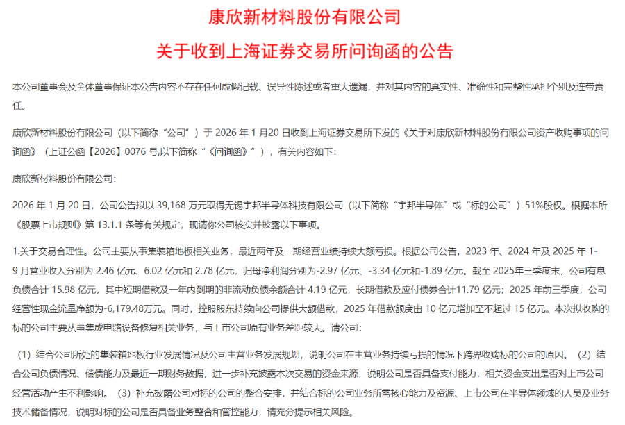 近日,康欣新材因高溢价跨界收购宇邦半导体一事,迅速引发上海证券交易所的“闪电”问询。这一动作不仅折射出监管层对跨界并购的高度警觉,更揭示了资本市场在产业转型热潮中潜藏的风险与博弈。