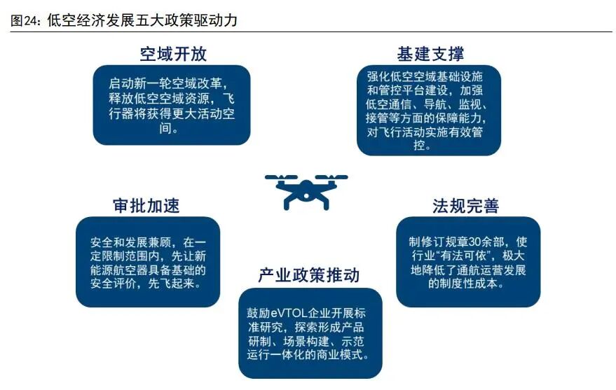 2014-2020 年的第三轮空域改革在珠三角和海南地区展开空域精细化管理改革试点,重点是优化空域审批制度和建立低空空管服务保障,加强“低慢小”航空器安全管控等,着力解决空域管理粗放、使用效率不高的问题。2018 年国家空管委批准四川开展低空空域协同管理改革试点,在全国率先成立了由省政府牵头、军民航空管系统和地方公安部门共同参加的“四川省低空空域协同管理委员会”,成为全国首个省级低空管理专职机构。通过整合军、民、企资源,四川在全国首创“申报-审批-监管”全链条数字化平台,将飞行审批时间从7 天压缩至2小时。在此期间,2016 年国务院印发《关于促进通用航空业发展的指导意见》将通用航空定位为 “战略性新兴产业”。 2020 年至今的空域改革突出空域协同化管理。在四川的基础上,国家空管委办公室先后批准湖南、江西、安徽 3 省的低空空域协同管理改革试点拓展。试点中,将原低空空域由军民航分块管理转变为军地民三方协同管理,将低空飞行由管制指挥模式转变为目视自主飞行模式;由军地民三方共同组成的低空空域协同管理运行中心,将任务、空域、飞行计划 3 个申请环节简化为飞行计划报备1个环节。与此同时,国家战略层面不断强化低空经济地位:从2021 年首次写入《国家综合立体交通网规划纲要》,到 2023 年底中央经济工作会议和2024 年政府工作报告将其列为战略性新兴产业,至 2024 年 7 月中共中央政治局集体学习明确要求“促进低空经济健康发展”,显示出顶层设计的持续深化。政策法规体系也加速完善,2023 年出台《无人驾驶航空器飞行管理暂行条例》及《国家空域基础分类方法》,首次为无人机设立适飞空域和 G、W 类非管制空域,2024 年深圳更出台全国首部低空经济产业促进条例,为制度创新提供地方实践。尽管跨军区协同、基础设施覆盖与适航认证等瓶颈仍存,我国空域管理制度正朝着分类化、数字化、服务化方向系统演进,为低空经济的安全健康发展提供制度保障。