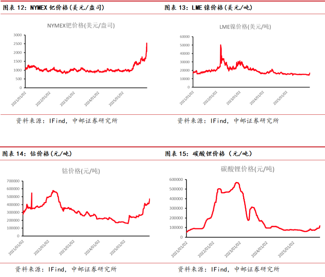 新能源金属方面:本周LME镍下跌0.56%、钴价持平、碳酸锂下跌11.57%。