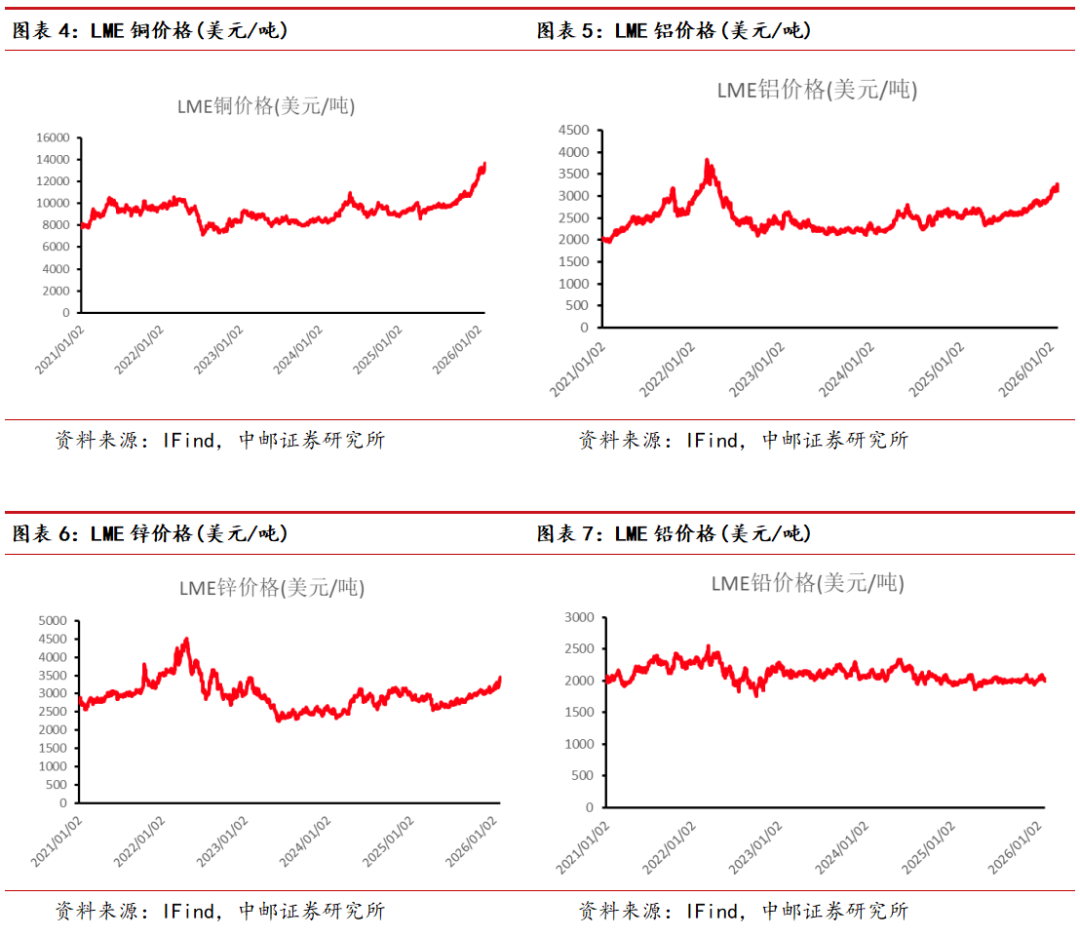 铜:价格波动较大,节后观察去库情况。本周铜价出现较大波动,周中由于南方铜业下调了2026和2027年的产量预期以及金银的暴涨催化下,铜价一度涨至14000美元以上的历史新高,但随后跟随金银出现剧烈回调。需求端,铜板带企业采购意愿下滑,加工市场疲态显现。此外,LME的库存搬家逻辑有所缓解,随着美国对铜加关税的预期缓解,纽铜溢价基本不存在。综合来看,由于自由港、泰克资源以及南方铜业等企业26年产量预期的下调,26年预计铜会出现供需紧张的局面,但目前金属市场对于供需的价格可能在弱化,等待价格波动率下降后观察节后国内市场的去库情况。