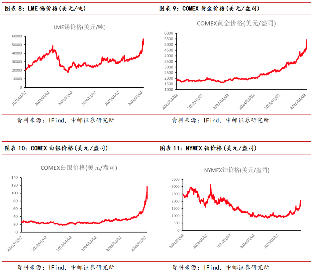 锡:锡价大幅回落,建议逢低布局。本周锡价大幅回落,主要受宏观事件影响,凯文·沃什或成为下任美联储主席,降息缩表主张导致资金对大宗金属配置倾向减弱,叠加价格涨速过快,锡价冲高回落。我们认为锡的供给端由于刚果金战乱、印尼政策、缅甸复产进度不及预期等原因仍维持较大不确定性,AI资本支出在26年继续维持高增,预计锡价在30-35万区间具备基本面支撑,建议逢低做多。