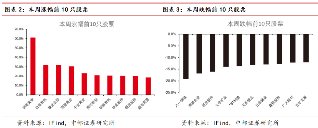 本周有色板块涨幅排名前5的是湖南黄金、白银有色(维权)、豫光金铅、西部黄金、中金黄金;跌幅排名前5的是八一钢铁(维权)、博威合金、银邦股份、大中矿业、*ST利源。