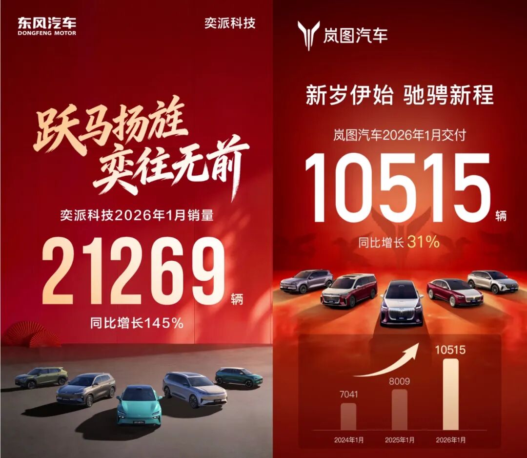 更令人惊喜的是东风汽车旗下的两大新能源品牌的表现。岚图汽车1月交付 10515辆,同比增长31%。东风奕派科技1 月销量21269辆,同比增长145%。