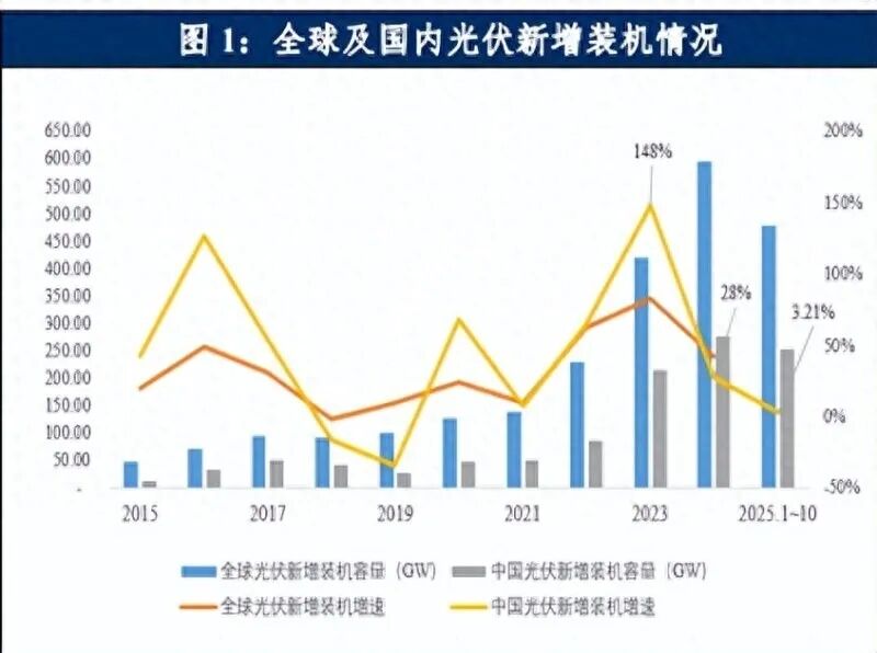 需求端的分化态势成为 2025 年行业的核心特征。国内市场受政策窗口期影响,呈现 “前高后低” 的装机节奏:上半年《分布式光伏发电开发建设管理办法》《关于深化新能源上网电价市场化改革促进新能源高质量发展的通知》等政策出台,推动在建项目与风光大基地项目赶工并网,1-6 月新增装机 212.21GW,同比增长 107%,其中 5 月单月新增 92.92GW,同比激增 388.03%;但 6 月后企业进入观望期,单月装机量断崖式下跌,全年预计新增装机 300GW,增速降至 7.9%。