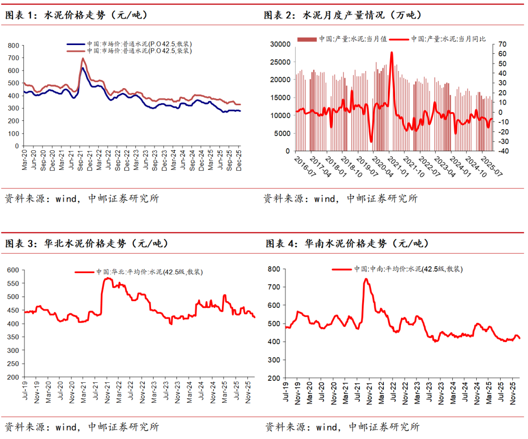 年末全国市场逐步进入淡季,全国需求仍呈现下滑态势,房建市场持续疲弱,基建需求在政策驱动下呈现区域分化明显,民用市场相对需求刚性,资金仍是制约需求释放重要因素。未来两周,全国大部分地区将迎来降温天气,加之春节临近,工人提前返乡,预计水泥需求将会明显减弱,后期价格多将以弱稳运行为主。25年12月单月水泥产量为1.44亿吨,同比下滑6.6%。