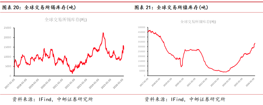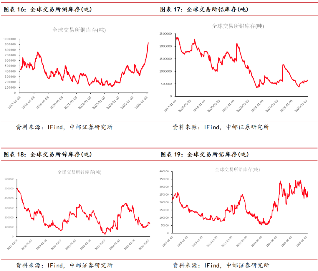 铝:无惧波动,继续逢低买入。本周沪铝下跌5.07%,跟随贵金属出现较大波动。库存方面,据SMM统计,本周四电解铝锭地区社会库存环比周一增加1.9万吨,累库来源地主要为无锡及巩义地区。短期来看,高铝价或继续抑制终端需求,叠加下游春节放假影响,部分型材、线缆等铝加工企业计划今年春节放假时间延长,但价格下跌后下游接货情况出现一定好转。 总体来看,在26年供给扰动,储能需求爆发的情况下,铝和铝权益逢低买入。