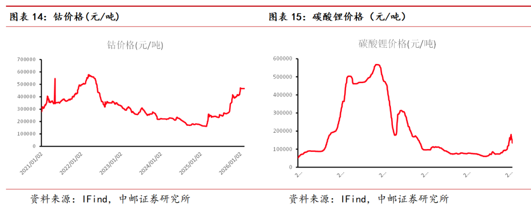 新能源金属方面:本周LME镍下跌10.79%、钴持平、碳酸锂下跌16.20%。