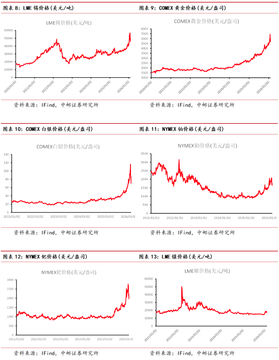 钽:供给冲击加速下游备货,钽价持续上涨。本周钽价持续上涨,鲁巴亚钶钽矿区停产导致下游贸易商加速备货,钽锭价格达到357万元/吨,周涨幅6.57%,年初至今涨幅26.6%。考虑到钽的年产量约2000吨,整体市场容量不到百亿,容易受下游囤货、投机资金炒作等因素影响,向上弹性大。此外,钽被美国政府列入战略关键矿产储备计划,叠加AI资本支出带动钽电容需求回暖,支撑钽价底部稳定上移。