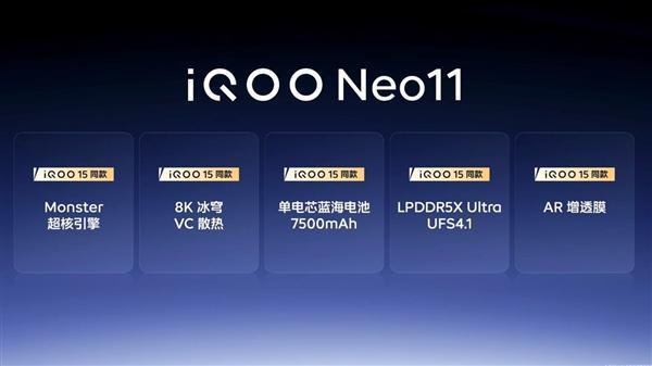 具体来说,iQOO Neo11采用2K LTPO旗舰屏,搭载京东方全新发光器件Q10+、iQOO 15同款AR增透膜,还配备iQOO 15同款自研太阳算法、iQOO 15同款全屏熄屏显示以及圆偏振光护眼技术。