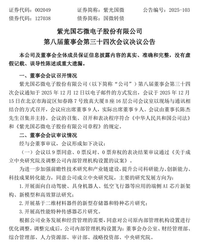 IT之家 12 月 15 日消息,紫光国微今日发布第八届董事会第三十四次会议决议公告,宣布成立中央研究院,进一步加强前瞻性技术研究和产业链建设,提升公司科研能力、创新能力、科技成果转化能力。