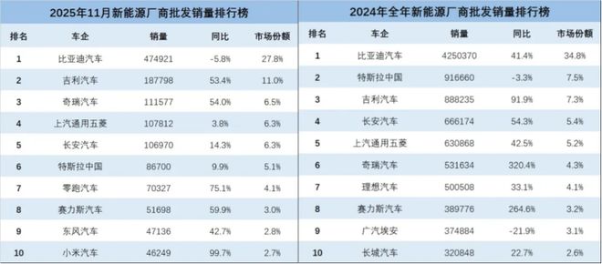 据乘联会公布的2025年11月新能源销量数据显示,奇瑞汽车单月销售111,577辆,同比增长高达54%,市场份额提升至6.5%。这一表现使其成功超越上汽通用五菱、长安汽车和特斯拉中国,跃居行业第三。与2024年全年排名对比,奇瑞的进步尤为显著。2024年,奇瑞汽车全年新能源销量为531,634辆,位居行业第六,市场份额仅为4.3%。一年时间,奇瑞实现了排名的三级跳,展现出强劲的增长势能。当前市场格局中,比亚迪仍以474,921辆的月销量稳居榜首,吉利汽车以187,790辆位列第二,并且奇瑞与前列企业的差距正在迅速缩小。
