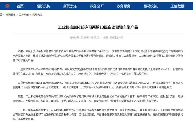 12月15日,工信部公布我国首批L3级有条件自动驾驶车型产品准入许可。来自长安汽车的深蓝 SL03和北汽集团极狐品牌的阿尔法 S两款纯电动轿车,在通过严格测试与安全评估后,获准在北京、重庆部分高速公路和城市快速路指定区域内开展上路通行试点。