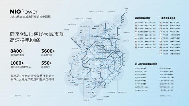 创业十一年,蔚来在充换电基础设施上累计投入约180亿元,是行业里建设充换电网络最为努力的公司。覆盖全国的8466座充换电站,其中高速换电网络已连通超550座城市,高速公路平均不到180公里就有一座蔚来换电站。在偏远却令人向往的“诗与远方”,蔚来仍坚持建设充换电设施,并向全行业开放——让电动车能去油车能去的一切地方。