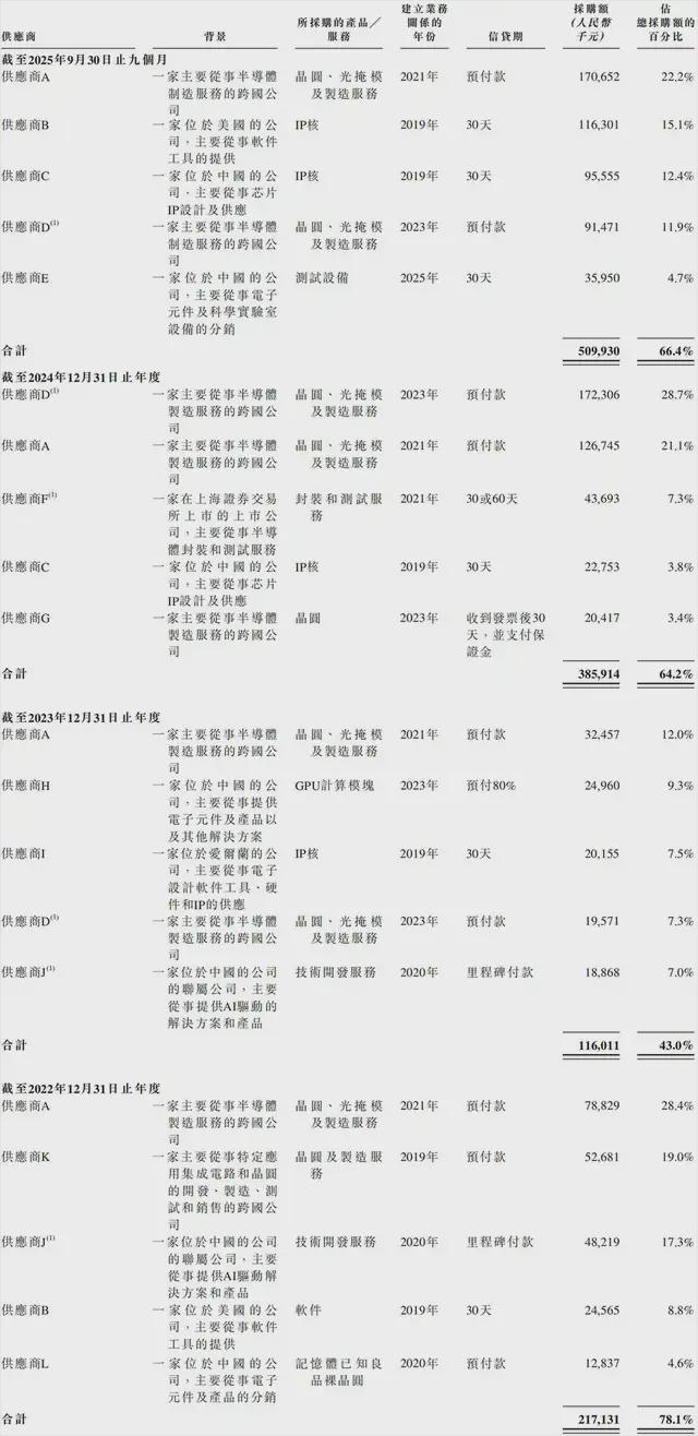 同期,爱芯元智向前五大供应商的采购额分别占总采购额的78.1%、43.0%、64.2%、66.4%。