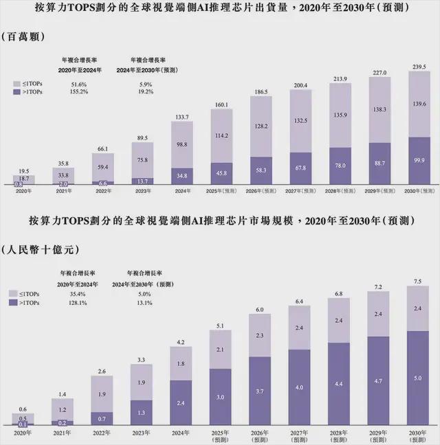 全球中高端视觉端侧AI推理芯片在2024年的出货量达3480万颗,约占总量的26.0%;预计到2030年将增至9990万颗,份额扩大至41.3%。