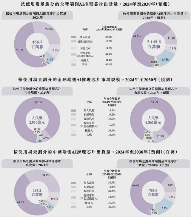 根据招股书,端侧AI推理芯片的应用场景涵盖个人设备、智能汽车、信息系统等领域,这些细分市场预计到2030年将在全球市场实现54.4%、48.9%及19.7%的出货量年复合增长率,在中国市场有望以更高增速发展,分别达到59.9%、55.3%、22.5%。