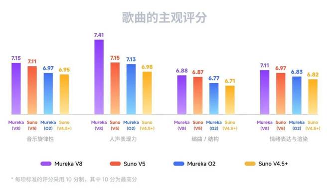在与 Suno V5 的较量中,Mureka V8 在专业音乐人参评的音乐旋律性、人声表现力、编曲 / 结构、情绪表达与渲染等主观指标上全面胜出,延续了对这个老对手的优势。