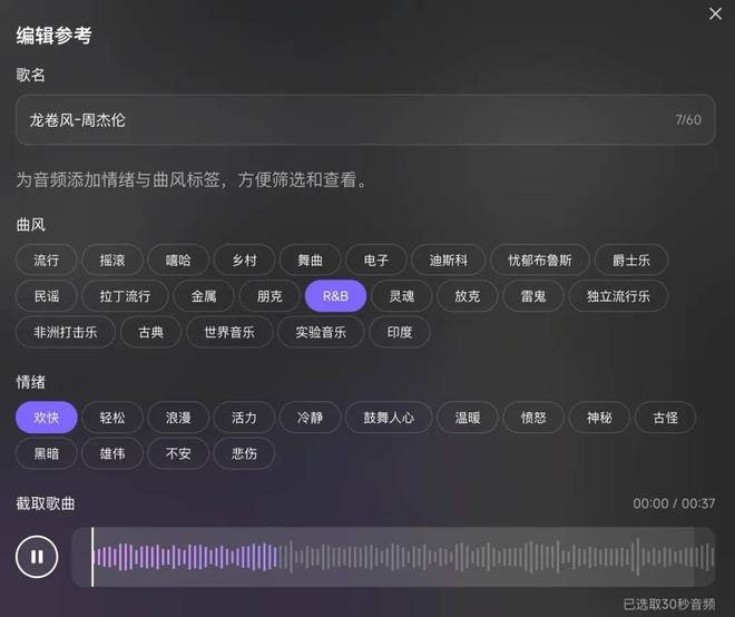 并且,这次生成增加了一个环节,让它参考周杰伦的《龙卷风》,并选定曲风(R&B)、情绪(欢快)。