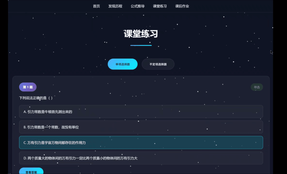 根据文件夹中的素材,制作一个《万有引力定律》的课件网页。需要有定律的发现过程、公式的推导、课堂练习、课后练习等等。整体需要制作精美、视觉化丰富。
