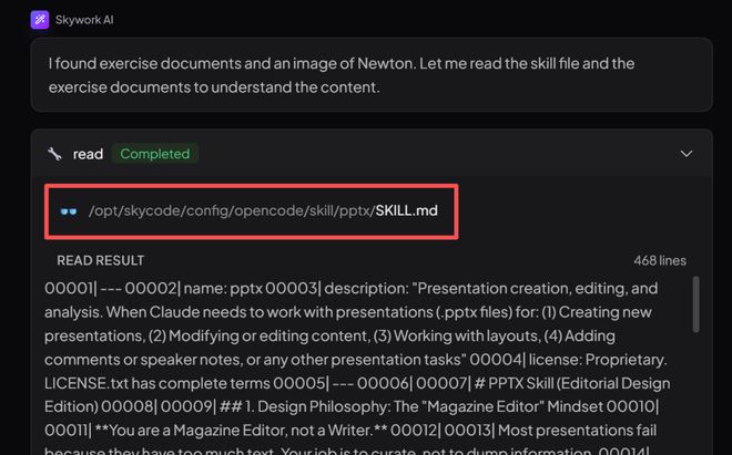 举个栗子,输入「帮我把这两份文档对比一下,做一个带图表的汇报PPT」时,Skywork会自动调用「文档读取」、「数据分析」和「PPT生成」这三个Skills组合。