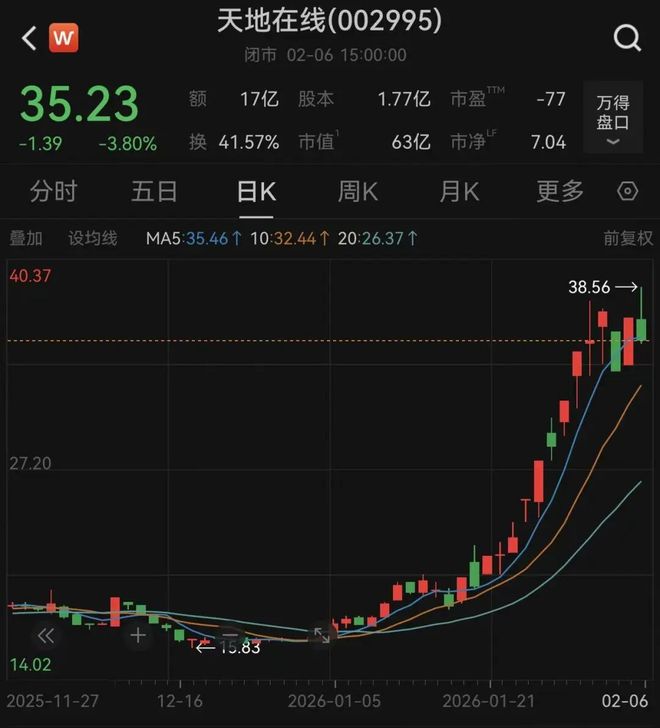 资本市场上,李亚鹏带火的翻倍牛股天地在线近期大幅波动,2月6日盘中再创新高后转跌,换手率达41.6%。