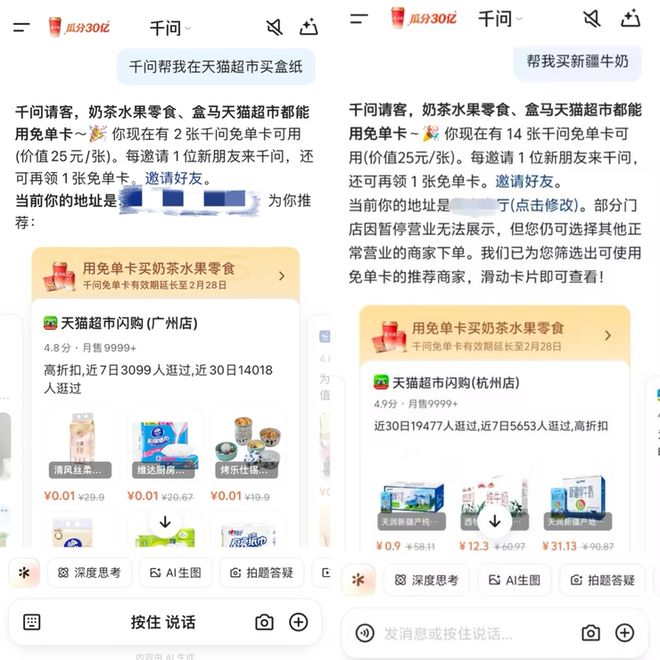 2月7日,天猫超市成为首个覆盖全国的AI超市,用户只需对千问APP说一句“帮我在天猫超市买洗衣液”、“帮我在天猫超市买箱纸巾”,千问就可以从天猫超市的海量商品中挑出适合的商品,在用户下单后即时配送。据了解,千问春节「免单卡」活动延续到2月28日,春节假期,天猫超市不仅能一句话送到家,还能享受25元免单优惠。