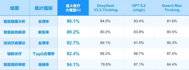 星火 X2 底座赋能医疗,助力星火医疗大模型核心能力全面提升并持续保持业界领先。基于居民健康档案的智能健康分析、智能报告解读、运动饮食建议、辅助诊疗、智能用药审核等关键任务上,模型能力均显著超越 DeepSeek V3.2、GPT-5.2 和 Qwen3-Max。