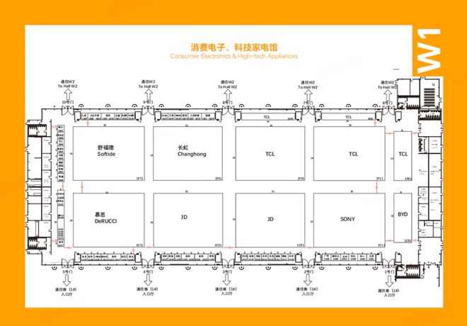 W1/W5馆(消费电子·智能家电馆):比亚迪、索尼、TCL、长虹、海信等大牌汇聚,消费电子、科技家电、智能汽车等产品集中亮相,感受全品类智能科技魅力。