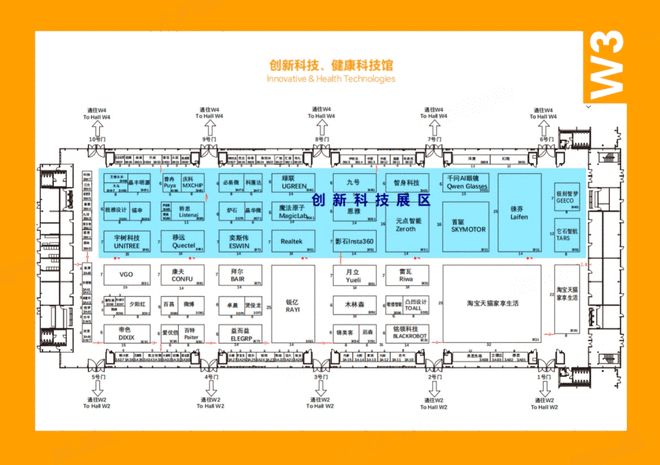 W3馆(创新科技·健康科技馆):前沿科技打卡核心区,宇树科技、魔法原子、影石Insta360、千问AI眼镜、徕芬、九号等品牌亮相,展示具身智能机器人、AI穿戴设备、全景影像、智能短交通等前沿成果,科技感拉满。