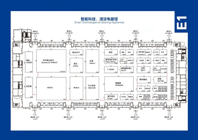 E1馆(智能科技·清洁电器馆):清洁电器天花板聚集地,科沃斯、添可、石头科技、iRobot、UWANT友望等头部品牌齐聚,主打扫地机器人、洗地机、割草机器人等智能清洁产品,是体验家庭清洁黑科技的必到场馆。