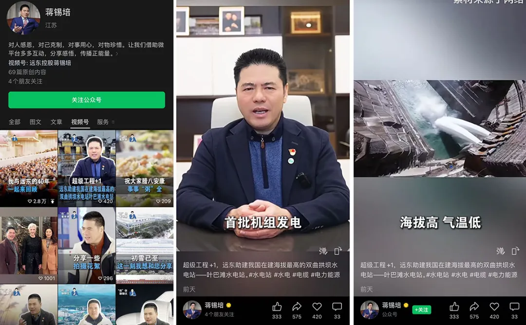 2月初,其视频号更新一条新内容——蒋身着深色西服坐在办公室,对外播报叶巴滩水电站首批机组发电,远东股份提供线缆支持的消息。