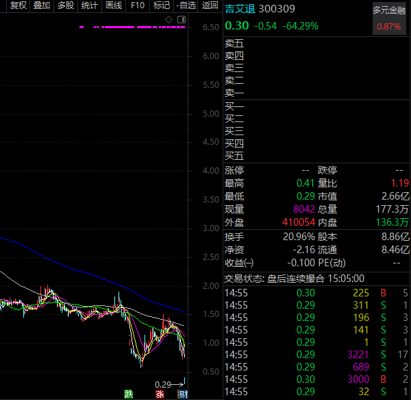 没有奇迹。在进入退市整理期交易首日,吉艾退股价暴跌,收盘跌幅超64%,再创历史新低。截至收盘,吉艾退总市值为2.66亿元。