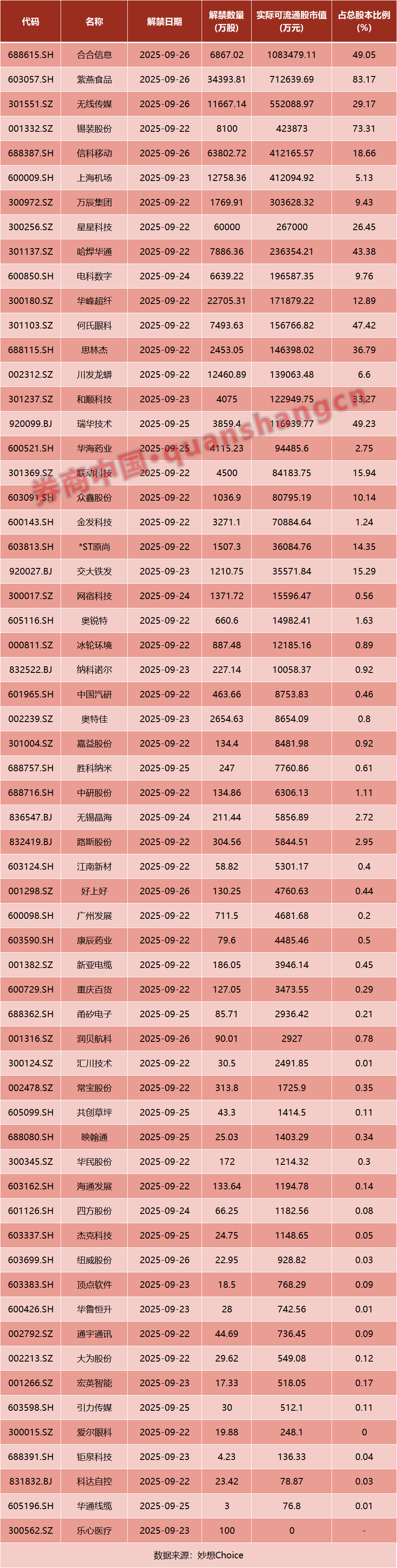 从解禁市值来看,解禁市值居前三位的是:合合信息(108.35亿元)、紫燕食品(71.26亿元)、无线传媒(55.21亿元)。