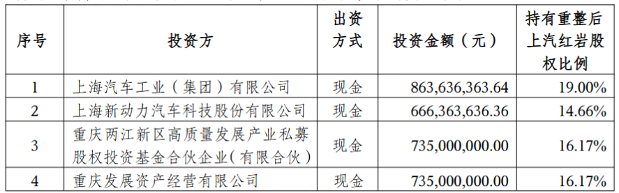 动力新科与上汽总公司等共同组成的联合体在本次投资中合计支付的投资金额为30亿元,如无其他投资方参与上汽红岩重整投资,动力新科与上汽总公司等共同组成的联合体预计将取得重整后上汽红岩66%股权,具体如下: