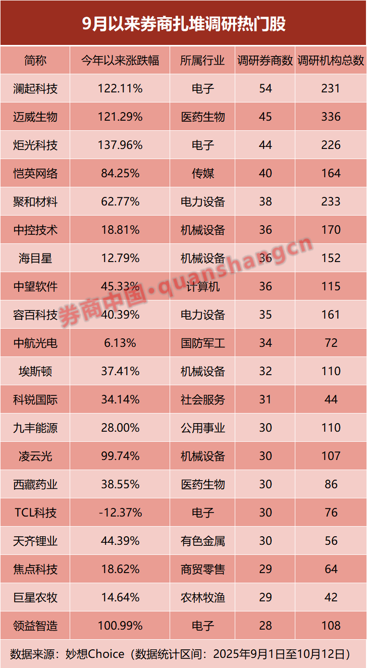 电子行业也在近期有不俗人气,券商9月来合计调研109家相关公司。其中,澜起科技、炬光科技9月份以来分别吸引了54家、44家券商调研,二者今年以来股价涨幅均在120%以上。此外,TCL科技、领益智造也分别吸引了30家、28家券商调研。