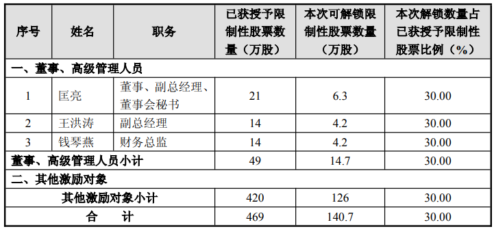 根据激励计划,59名激励对象的限制性股票解除限售条件已成就,合计解除限售的股票数量为141万股。本次激励计划的授予价格为11.09元/股。具体如下: