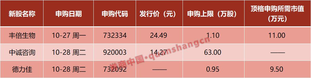 本周(10月27日—10月31日)有3只新股发行。周一:丰倍生物;周二:中诚咨询、德力佳。