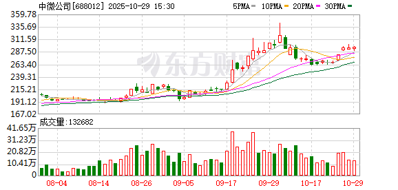 10月29日,中微公司(688012)公布2025年三季报,公司营业收入为80.6亿元,同比上升46.4%;归母净利润为12.1亿元,同比上升32.7%;扣非归母净利润为8.87亿元,同比上升9.1%;经营现金流净额为12.98亿元,同比增长385.2%;EPS(全面摊薄)为1.9344元。