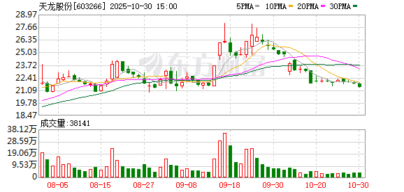 10月30日,天龙股份(603266)公布2025年三季报,公司营业收入为9.47亿元,同比下降3.1%;归母净利润为8270万元,同比上升0.2%;扣非归母净利润为7943万元,同比上升3.8%;经营现金流净额为1.08亿元,同比下降15.6%;EPS(全面摊薄)为0.4158元。
